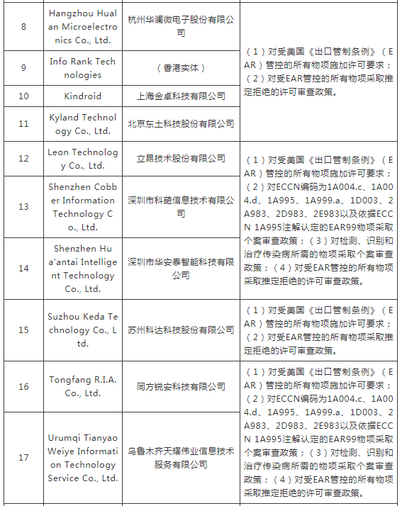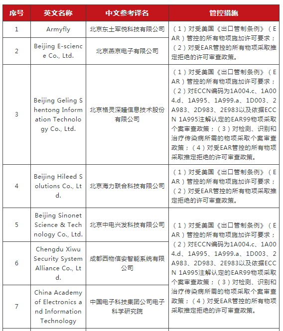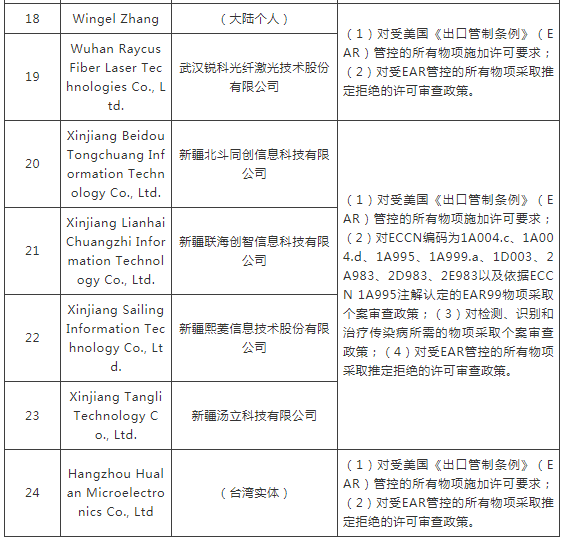 ERC認定以下實體與所謂“中國在新疆的侵犯人權行動”有牽連(lian),違反美國外交政筴,將其(qi)列入“實體清單”。